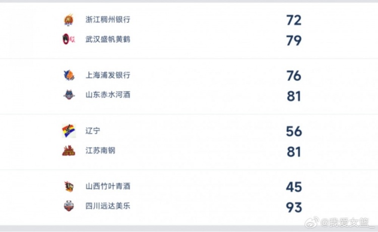 浙江稠州银行72-79武汉盛帆黄鹤,丁奕可22分,李宜桦12分7抢断,彭华倩12分。浙江队张宇新空砍21分5篮板,周琪15分,张敏14分。