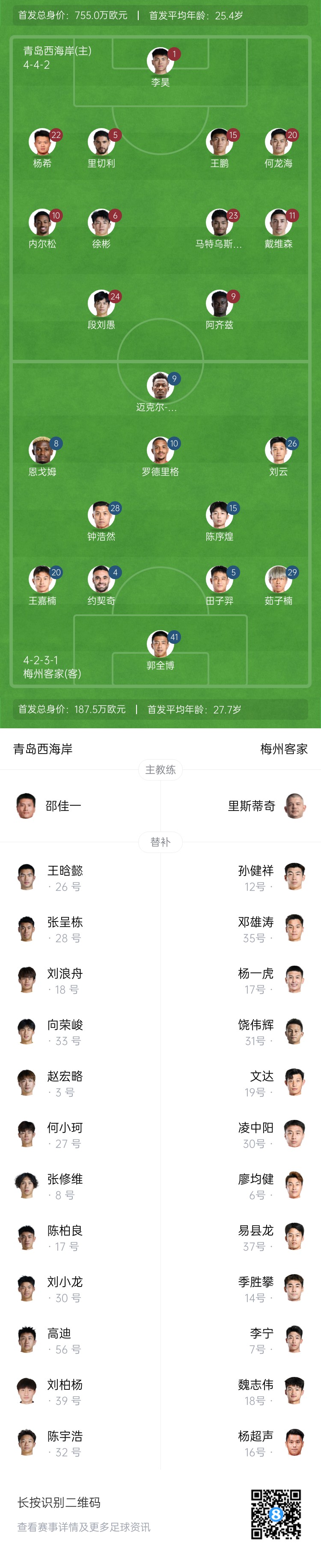 青岛西海岸首发:1-李昊、5-里切利(F)、6-徐彬、22-杨希、15-王鹏、20-何龙海、23-马特乌斯(F)、24-段刘愚、9-阿齐兹(F)、10-内尔松卢斯(F)、11-戴维森(F)
