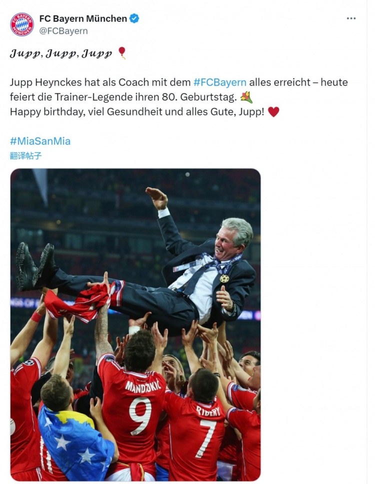5月9日讯 今天是拜仁功勋主帅海因克斯的80岁生日,拜仁官方为他送上祝福。