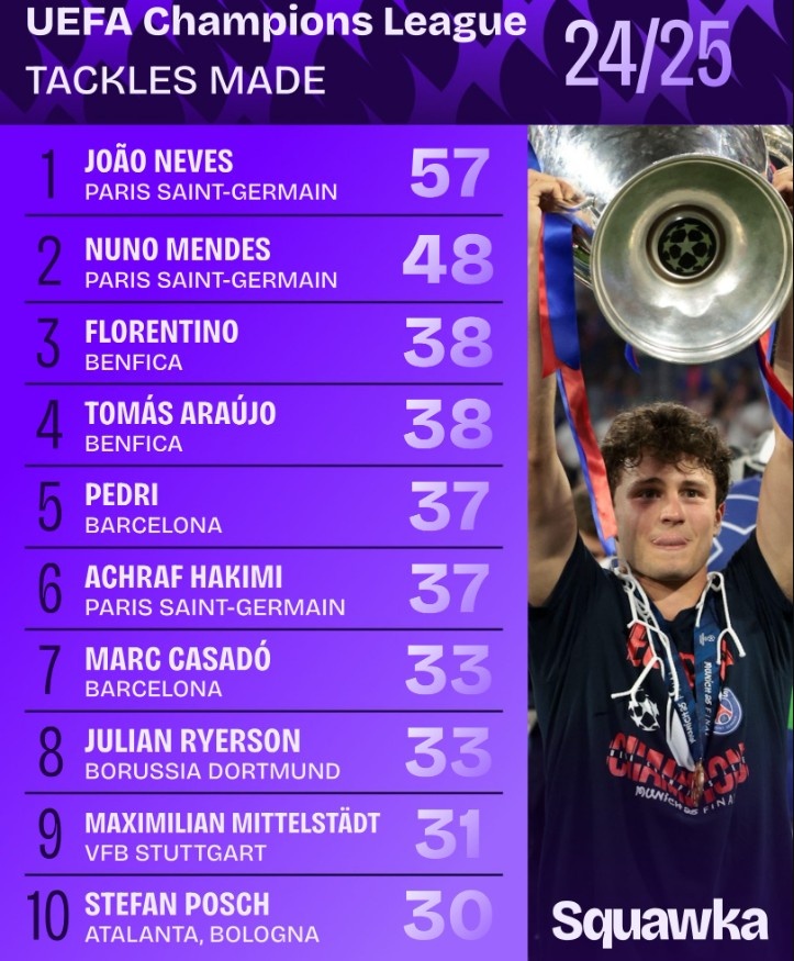 2024-25赛季欧冠铲断榜:若昂-内维斯57次居首,努诺-门德斯次之