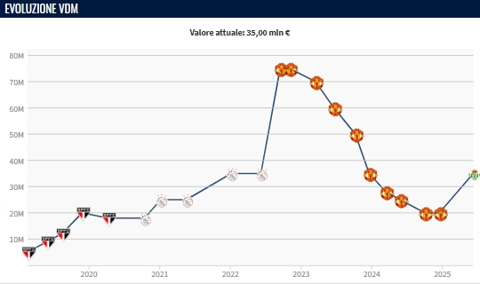 而在2022年11月-2024年10月,安东尼的身价经历7次下跌,最终跌至2000万欧元。